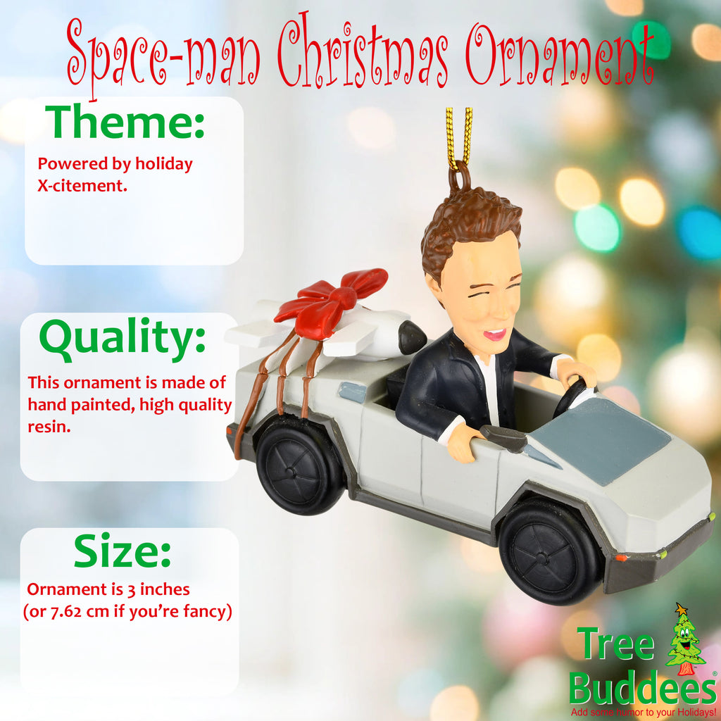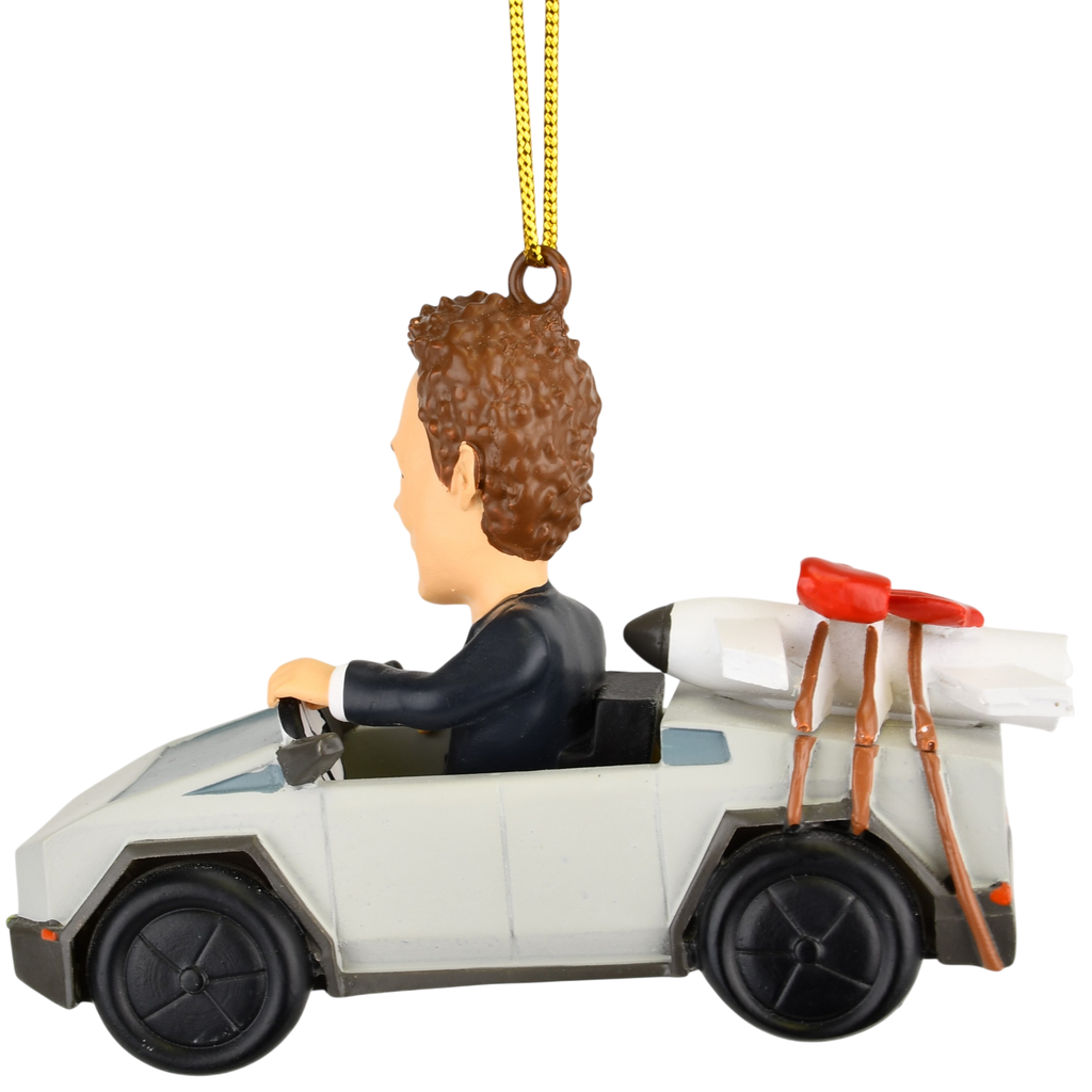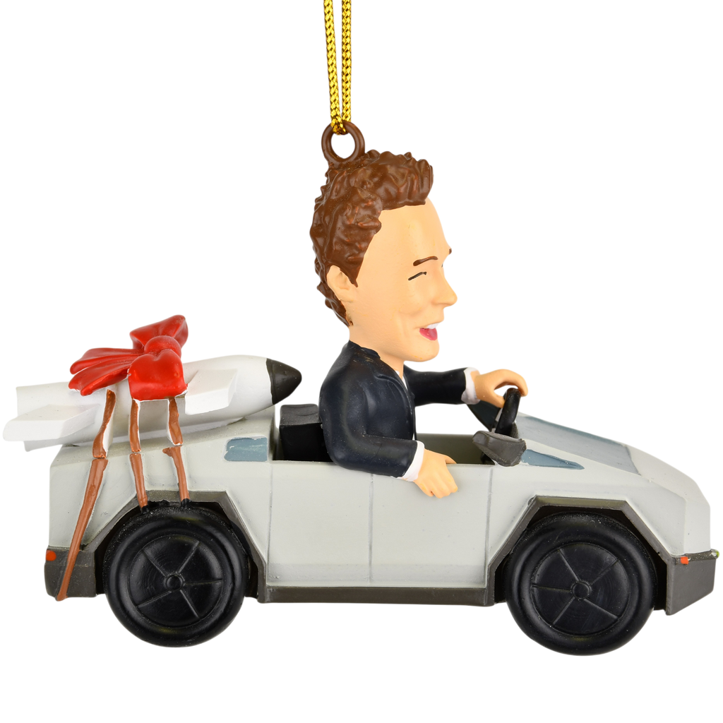 - 🚀 Over-the-Top Holiday Fun – Elon-inspired parody ornament featuring a futuristic cyber truck with a rocket strapped to the back and topped off with a festive red Christmas bow. Equal parts weird, wacky, and wonderful.