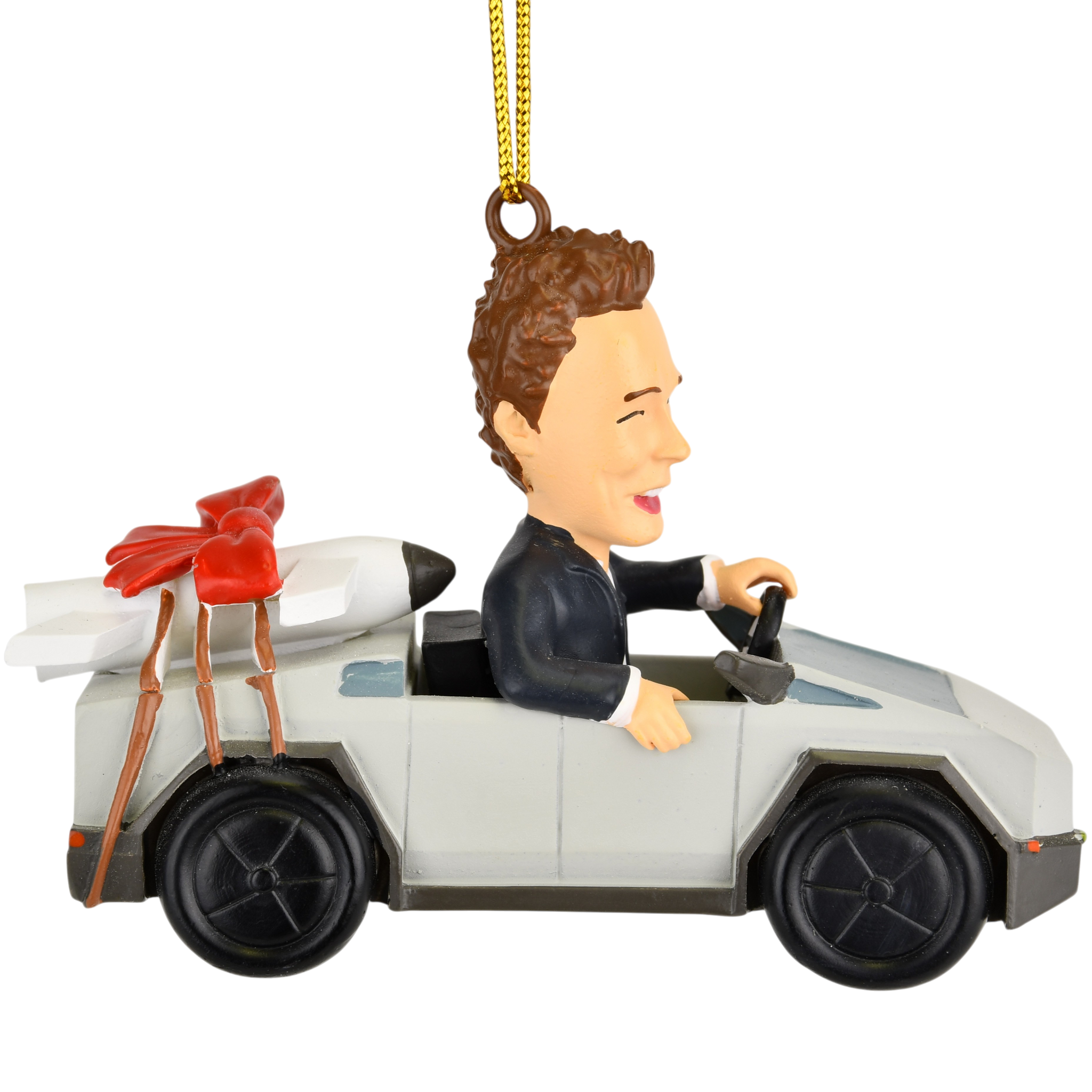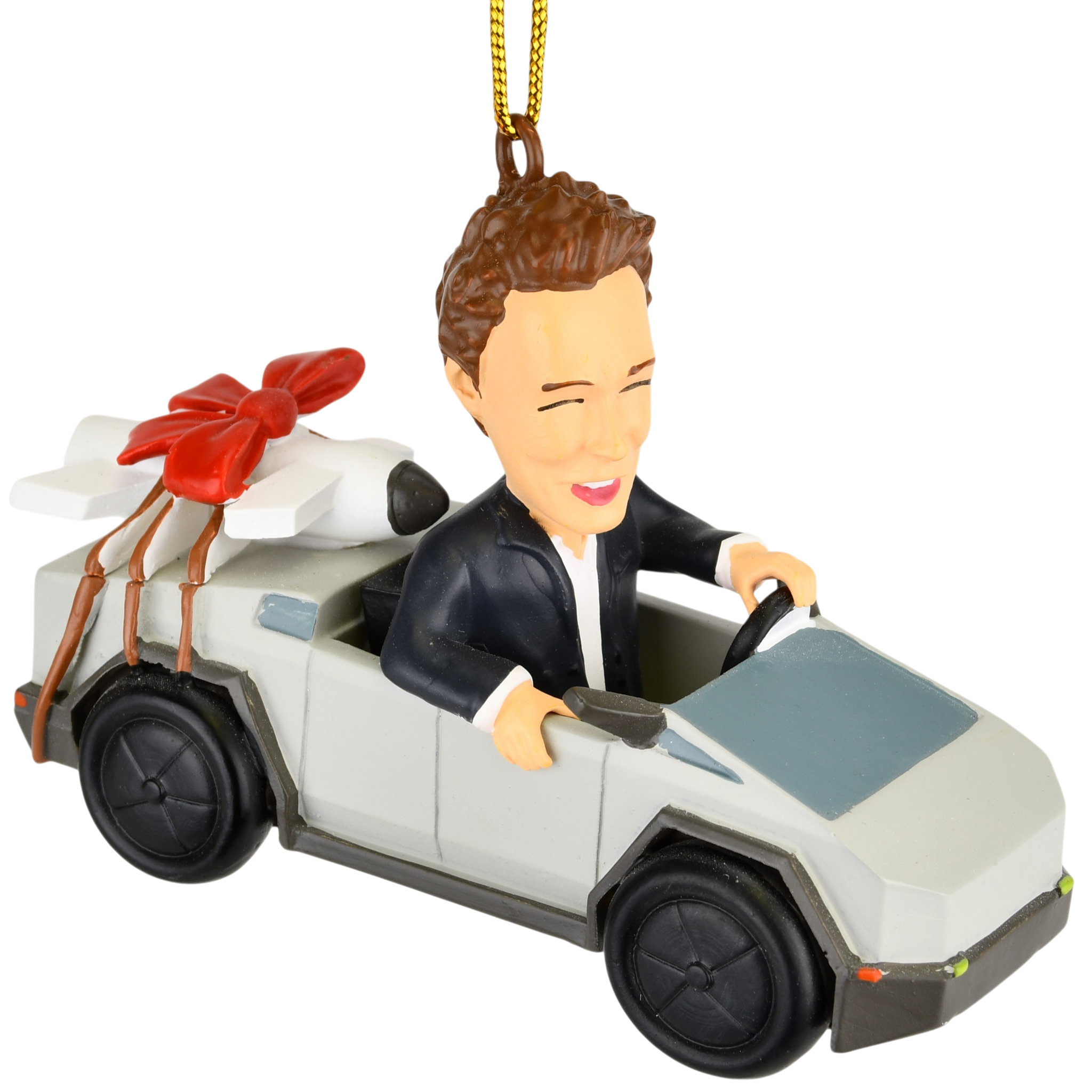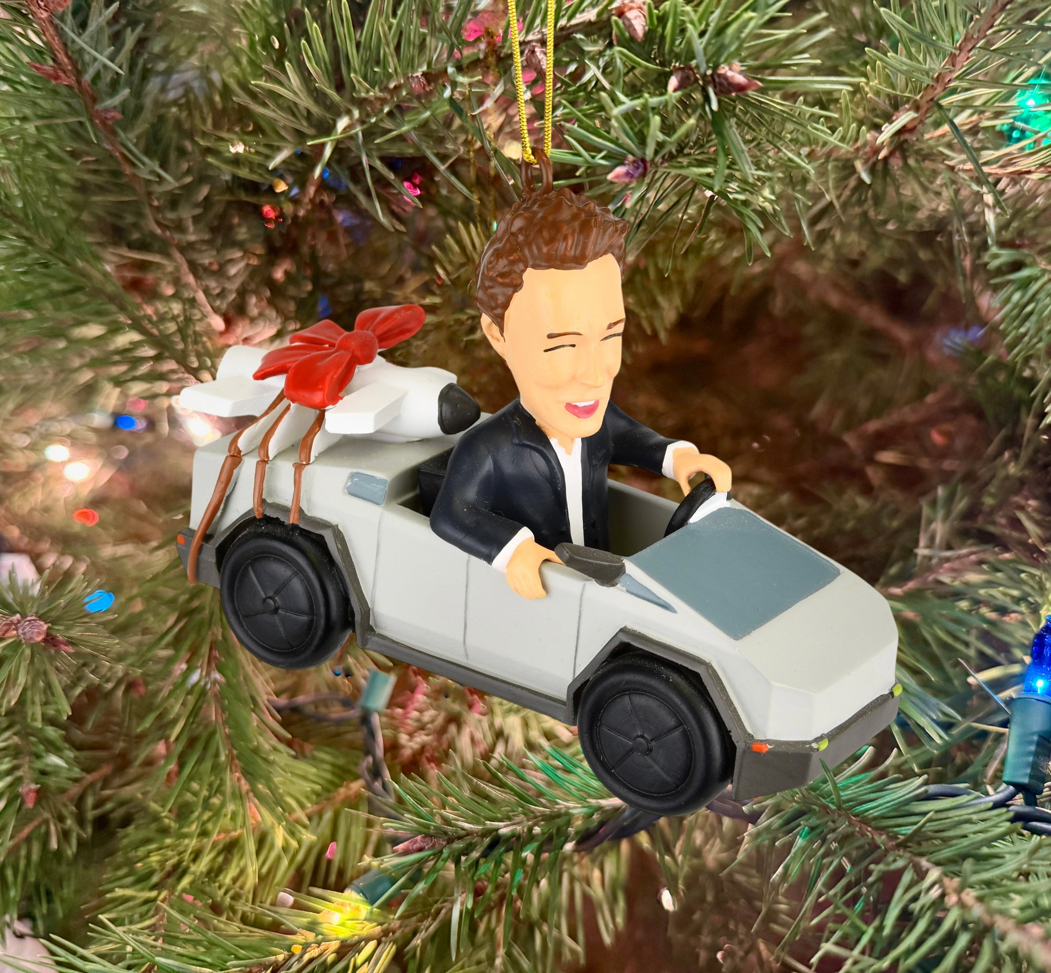 - 🚀 Over-the-Top Holiday Fun – Elon-inspired parody ornament featuring a futuristic cyber truck with a rocket strapped to the back and topped off with a festive red Christmas bow. Equal parts weird, wacky, and wonderful.